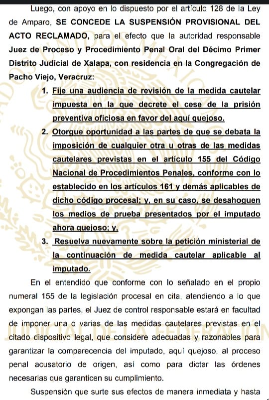En la suspensión provisional se orden al juez primero del distrito judicial de Xalapa que se fije una nueva audiencia de revisión de medida cautelar impuesta, en la que se decrete el cese de la prisión preventiva oficiosa y que se tome alguna otra de las 13 medidas que hay en el Código de Procedimientos Penales.