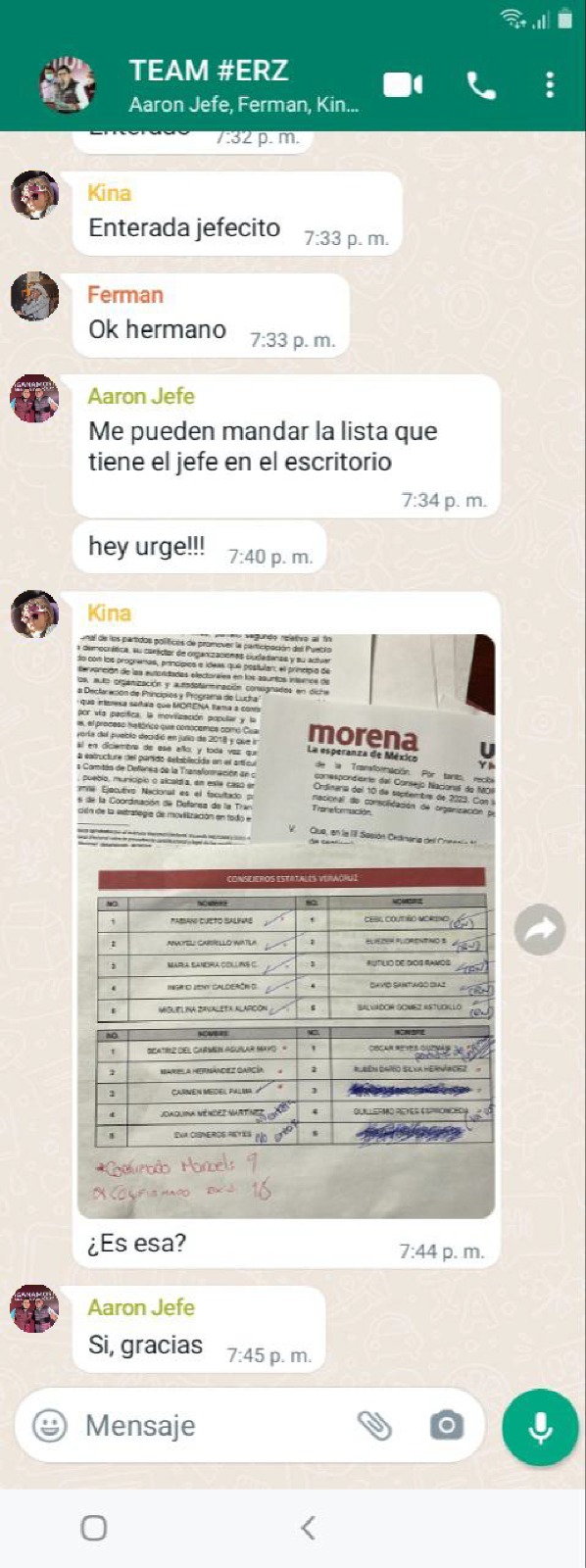 En otra captura de un presunto grupo denominado TEAM #ERZ se observa una fotografía de una lista con nombres de supuestos consejeros palomeados quienes votarían a favor de Rocío Nahle.