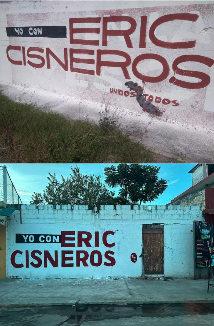Asimismo, la Secretaria del Trabajo en Veracruz, Dorheny García Cayetano, deja su firma en las bardas de apoyo a Cisneros. ¿Casualidad o coincidencia?