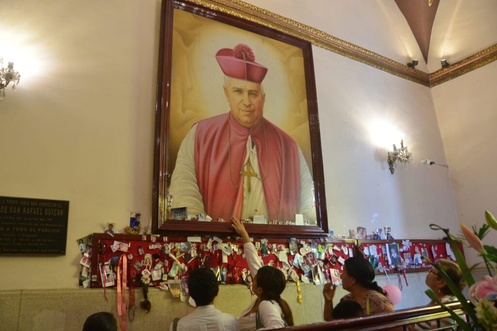 Niños vestidos de San Rafael, adultos, adultos mayores que de rodillas acuden a la tumba del obispo para agradecer los favores solicitados y concedidos o pagar una manda.