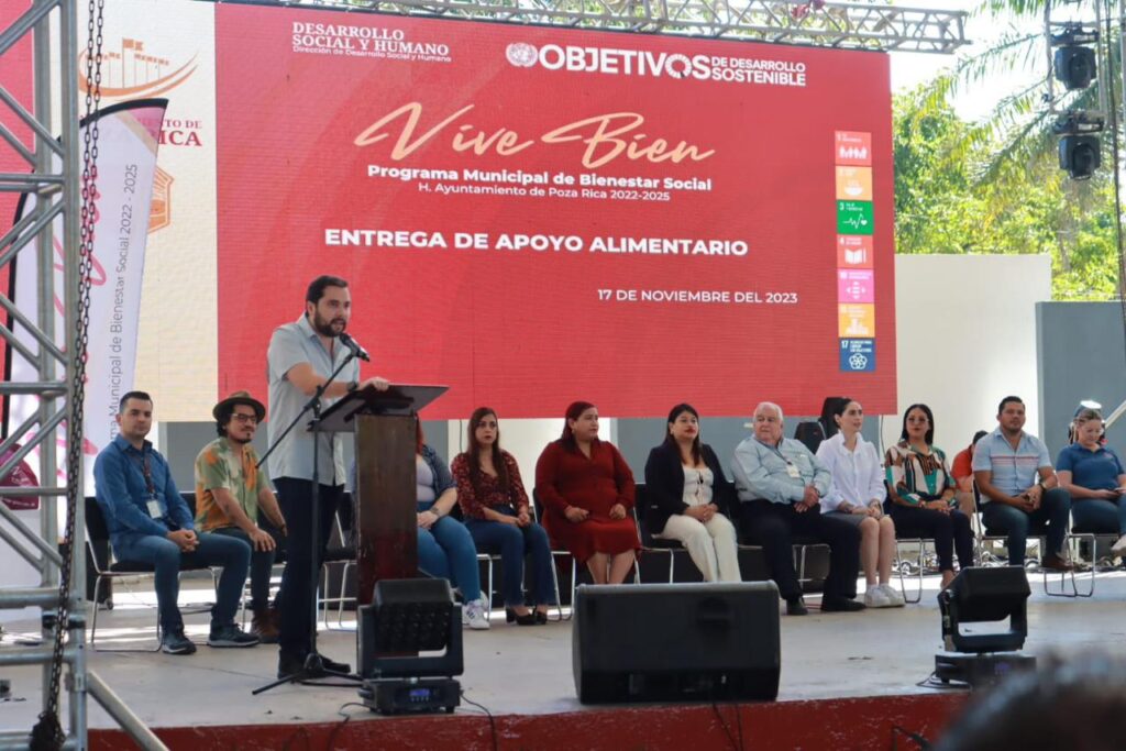 Poza Rica, Ver.- Con programas de bienestar social y atención directa sin intermediarios, el Gobierno de la Cuarta Transformación está cumpliendo con dar Justicia Social a las familias pozarricences y veracruzanas, subrayó el Director Administrativo de Servicios de Salud de Veracruz, Jorge Sisniega Fernández, en el marco de la entrega de apoyos alimentarios del programa municipal de Desarrollo Social “Vive Bien”, en Poza Rica.