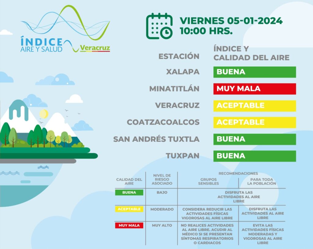 Por su parte, las estaciones de monitoreo de Veracruz y Coatzacoalcos señalaron una calidad del aire aceptable, con un nivel de riesgo moderado, por lo que considera reducir las actividades físicas vigorosas al aire libre.