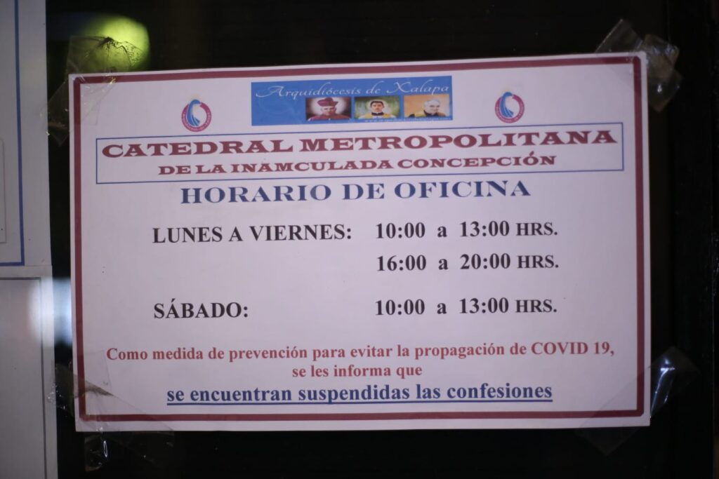 Xalapa, Ver.- La Iglesia Catedral Metropolitana de Xalapa informó a su feligresía que, para evitar el contagio de covid-19, se suspende el sacramento de la confesión, lo anterior a través de un aviso colocado al interior del templo.