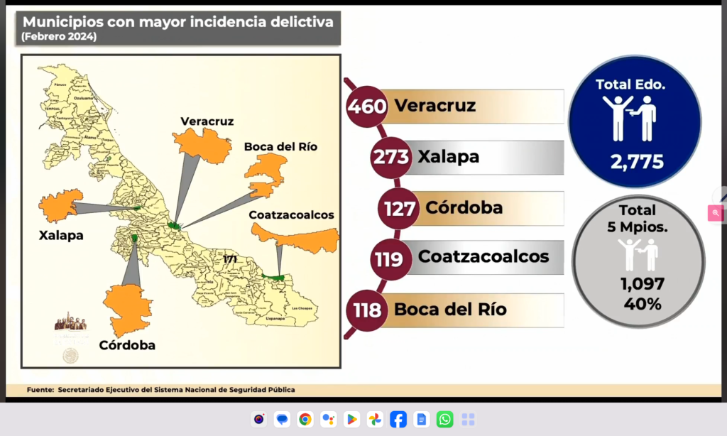 En la conferencia de prensa que ofreció el presidente de la República en Coatzacoalcos, al sur del estado, el secretario dijo que los municipios con más casos de homicidios dolosos son Veracruz Puerto con 460, Xalapa con 272, Córdoba con 127, Coatzacoalcos con 119 y Boca del Río con 118.