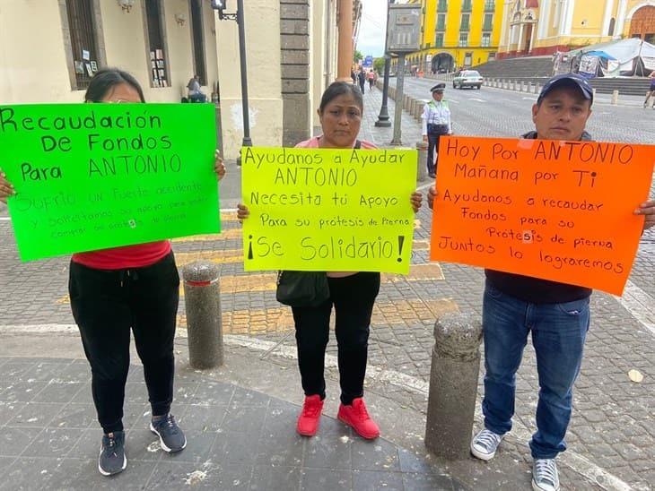 Xalapa, Ver.- Antonio Castillo perdió su pierna izquierda tras un accidente con otro motociclista, hoy su familia está realizando una colecta en las calles del centro de Xalapa para obtener la prótesis que necesita para mejor así su calidad de vida.