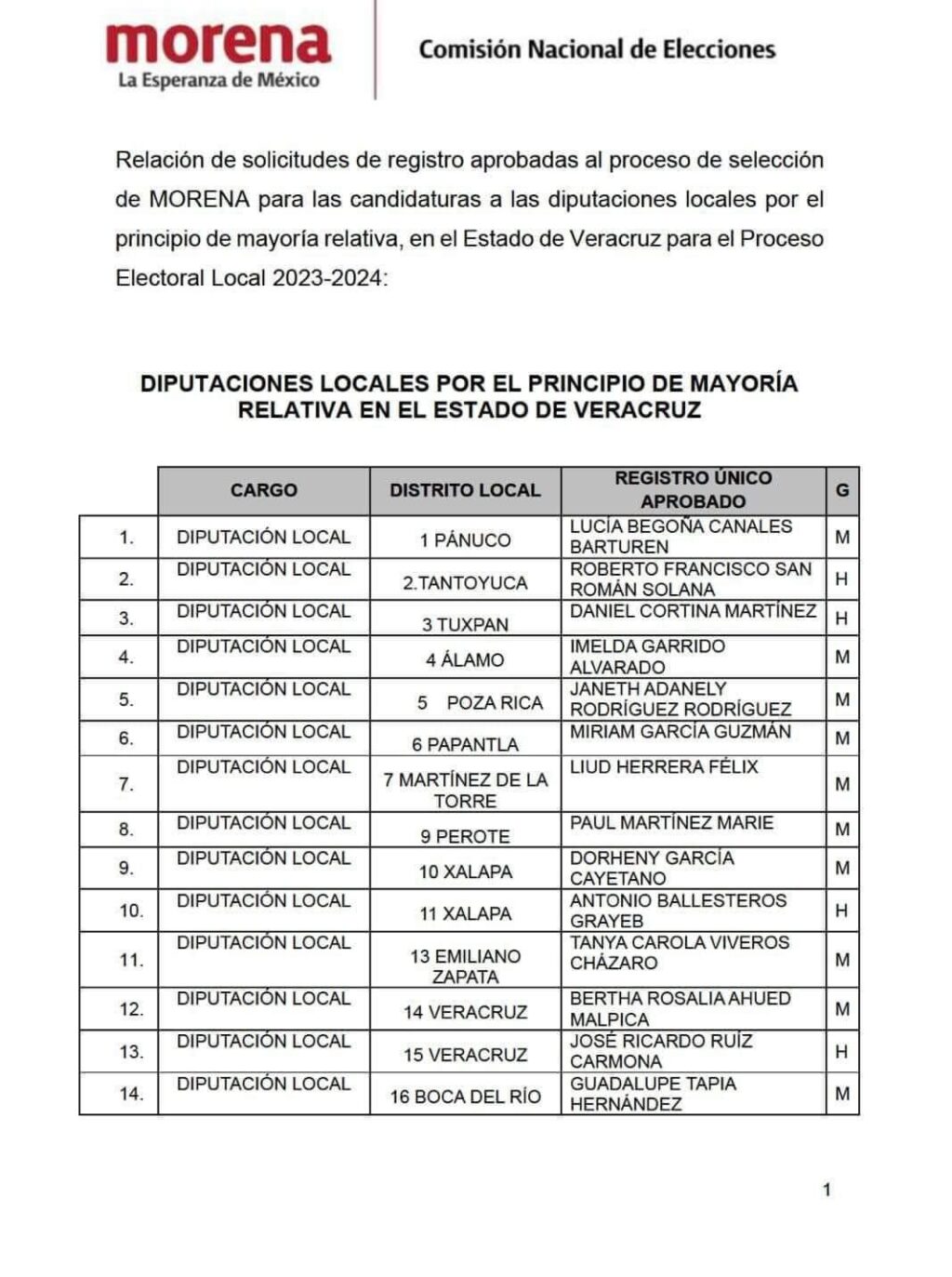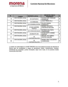 La Comisión Nacional de Elecciones de Morena emitió la relación de solicitudes de registro aprobadas al proceso de selección para las candidaturas a las diputaciones locales por el principio de mayoría relativa en el estado de Veracruz para este proceso electoral.