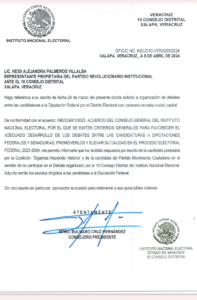 En el oficio No. INE/JD10-VER/0259/2024 emitido por el Consejo Distrital 10 de Xalapa del Instituto Nacional Electoral que encabeza el consejero presidente Bulmaro Cruz Hernández, se informó que las dos candidatas declinaron la invitación.