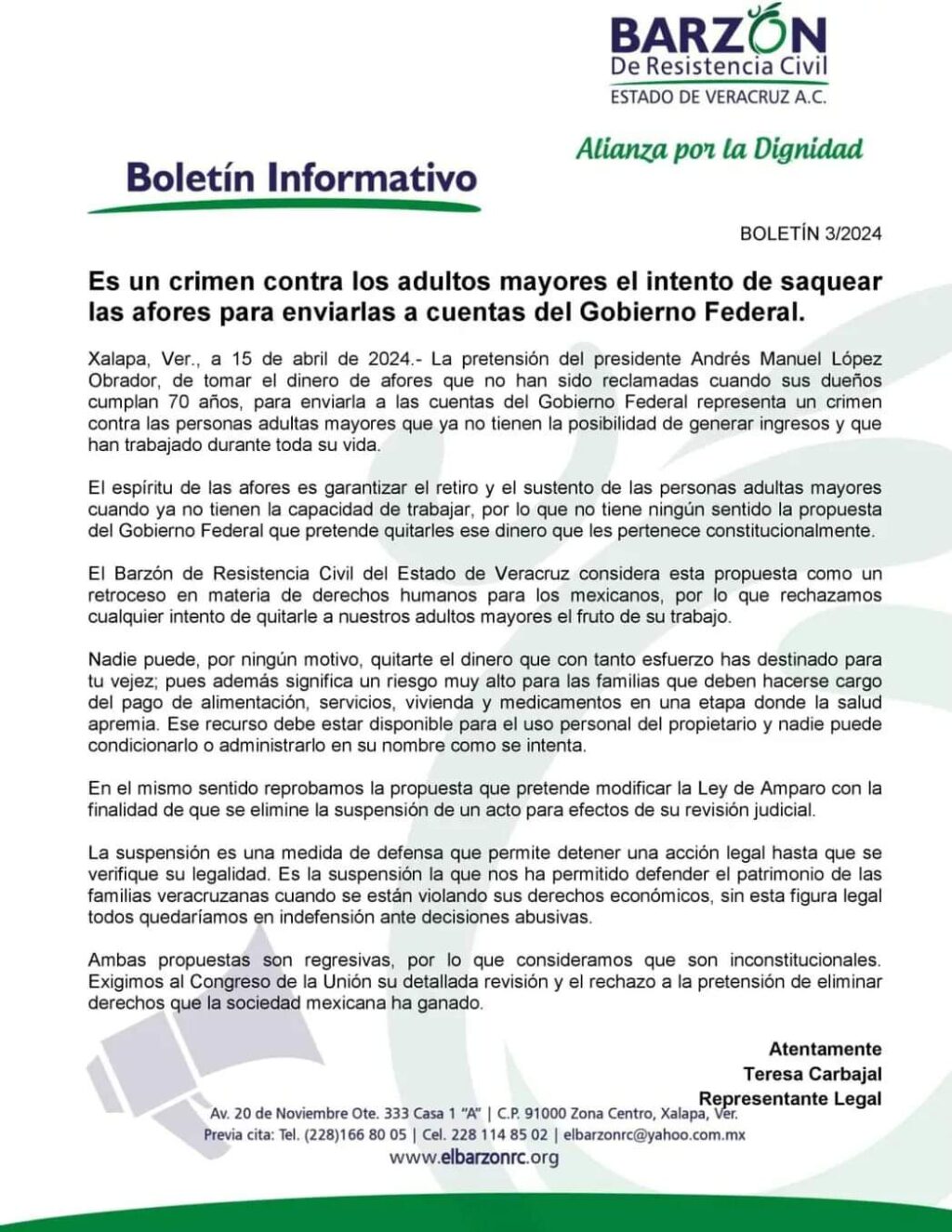 “El Barzón de Resistencia Civil del Estado de Veracruz considera esta propuesta como un retroceso en materia de derechos humanos para los mexicanos, por lo que rechazamos cualquier intento de quitarle a nuestros adultos mayores el fruto de su trabajo”.