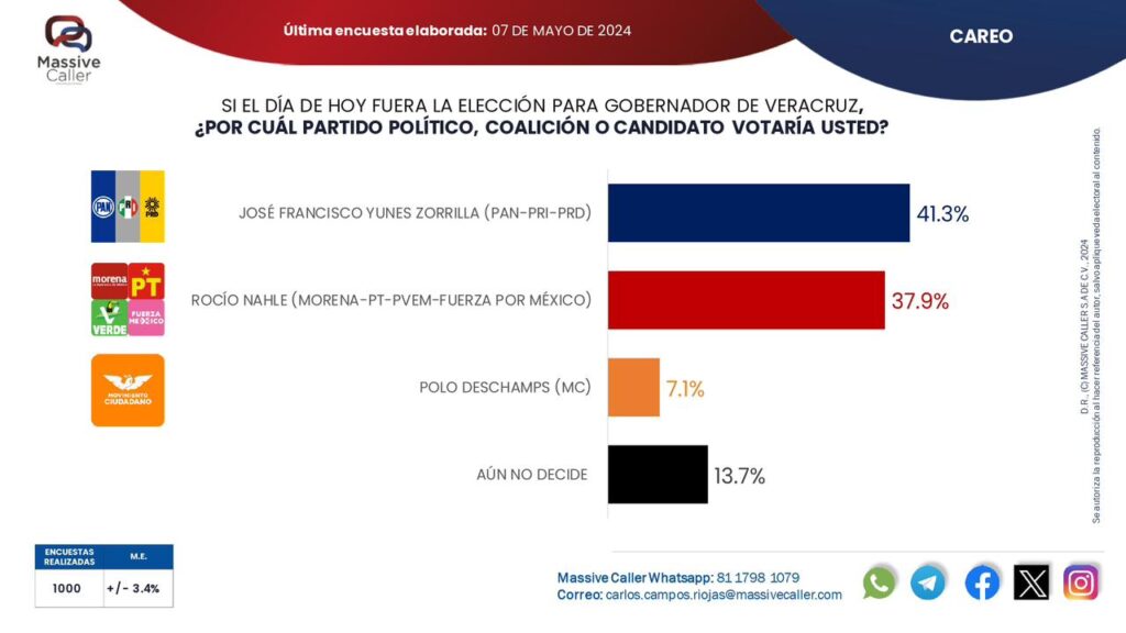 En particular, la última encuesta de Massive Caller, realizada el 7 de mayo, posiciona a Pepe Yunes con un 41.3% de la intención de voto, superando a Rocío Nahle de Morena, quien alcanza un 37.9%, y a Polo Deschamps de Movimiento Ciudadano, con un 7.1%.