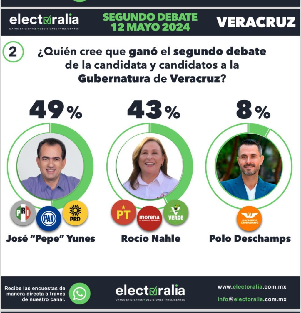 Electoralia, en su encuesta post-debate, encontró que el 49% de los participantes consideró que Pepe Yunes ganó el debate, con Rocío Nahle siguiendo con un 43% y Polo Deschamps con un 8%. En términos de quién presentó las mejores propuestas, los resultados fueron similares: Yunes con un 49%, Nahle con un 42%, y Deschamps con un 9%.