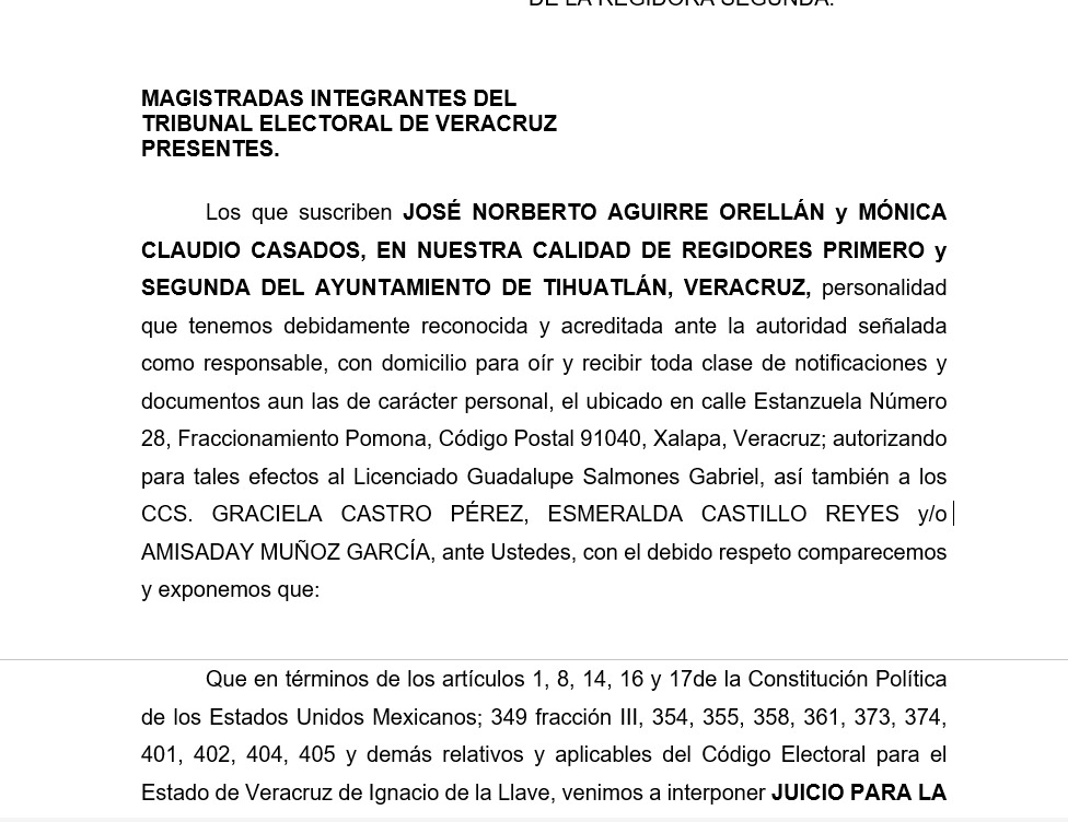 Ante esta situación presentaron una denuncia ante el Tribunal Electoral del Estado de Veracruz (TEV) por la violación a sus derecho político-electorales contra el alcalde Leobardo Gómez así como contra otros funcionarios municipales.