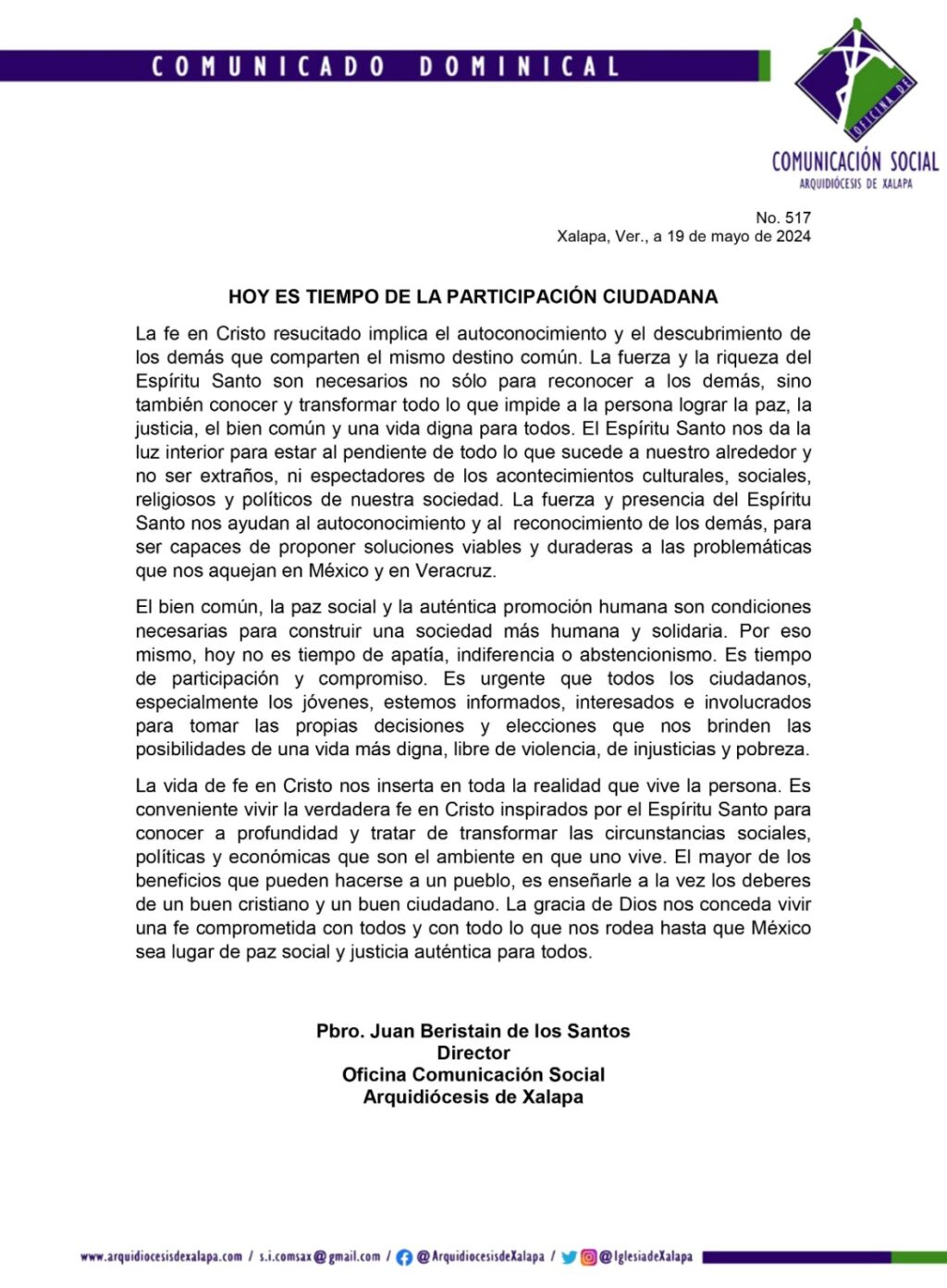 “El Espíritu Santo nos da la luz interior para estar al pendiente de todo lo que sucede a nuestro alrededor y no ser extraños ni espectadores de los acontecimientos culturales, sociales, religiosos y políticos de nuestra sociedad. La fuerza y presencia del Espíritu Santo nos ayudan al autoconocimiento y al reconocimiento de los demás, para ser capaces de proponer soluciones viables y duraderas a las problemáticas que nos aquejan en México y en Veracruz”.