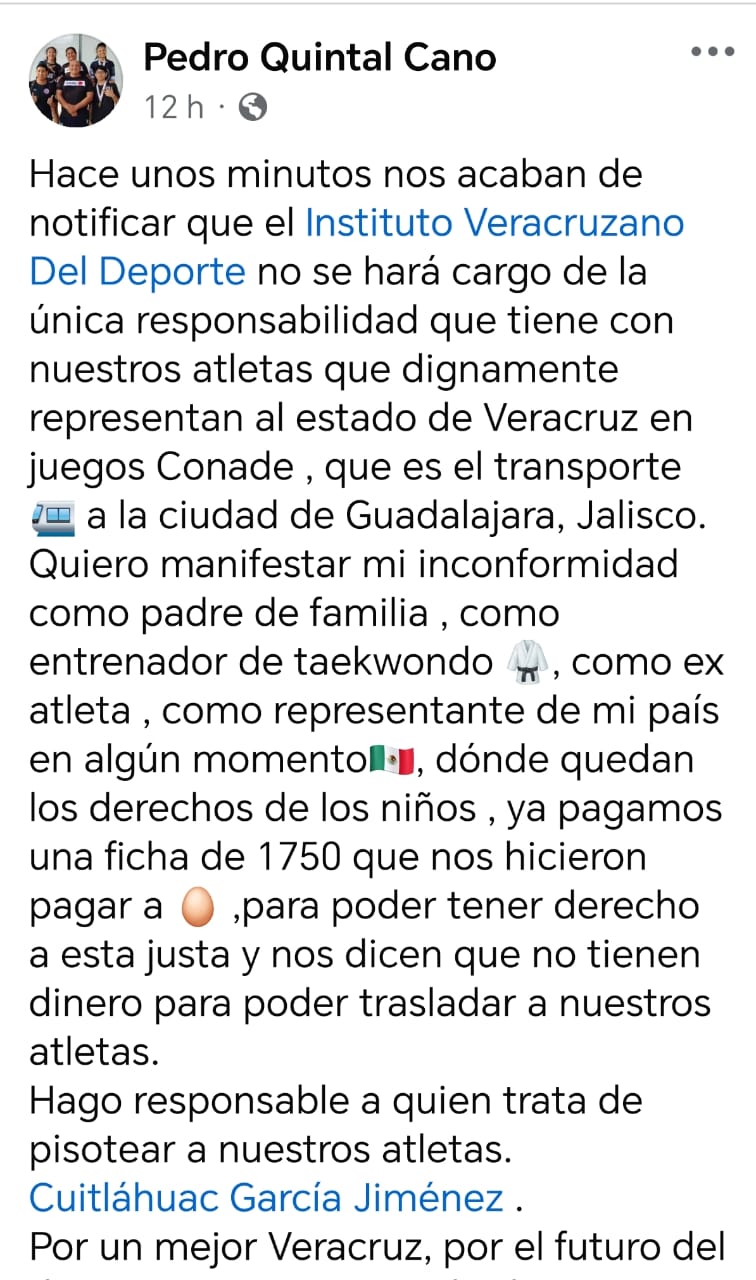 En redes sociales profesores y entrenadores de los taekuandoines acusaron que el Ivd no se hará cargo de la «única responsabilidad que tiene con nuestros atletas que dignamente representan al estado de Veracruz en juegos Conade , que es el transporte a la ciudad de Guadalajara, Jalisco».
