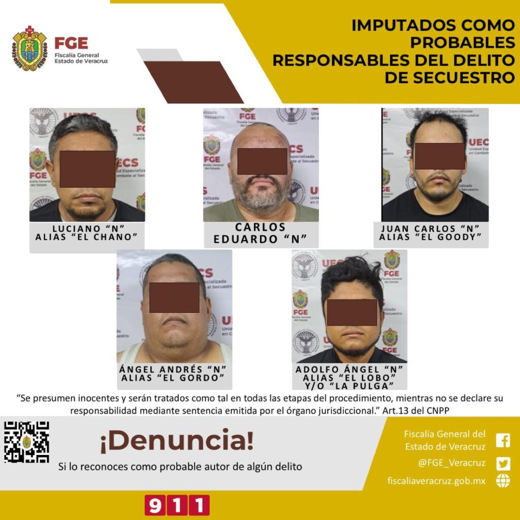 Xalapa, Ver.- Las cinco personas detenidas el viernes pasado en Tierra Blanca, tras la liberación de 8 migrantes privados de su libertad, entre ellos un menor de edad, ya fueron imputados por el delito de secuestro, informó en un comunicado de prensa la Fiscalía General del Estado (FGE).