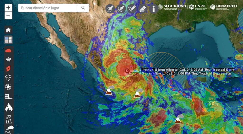 La Coordinación Nacional de Protección Civil actualiza el Boletín SIAT-CT para la Tormenta Tropical Alberto, manteniendo Alerta Naranja (Peligro Alto) por Ciclón Acercándose para el norte de Veracruz, pero cambiando las alertas Amarilla y Verde al modo Ciclón Alejándose para el centro y sur del estado, respectivamente. Este cambio significa mantener la vigilancia ante las lluvias y vientos asociados al desplazamiento de la tormenta.