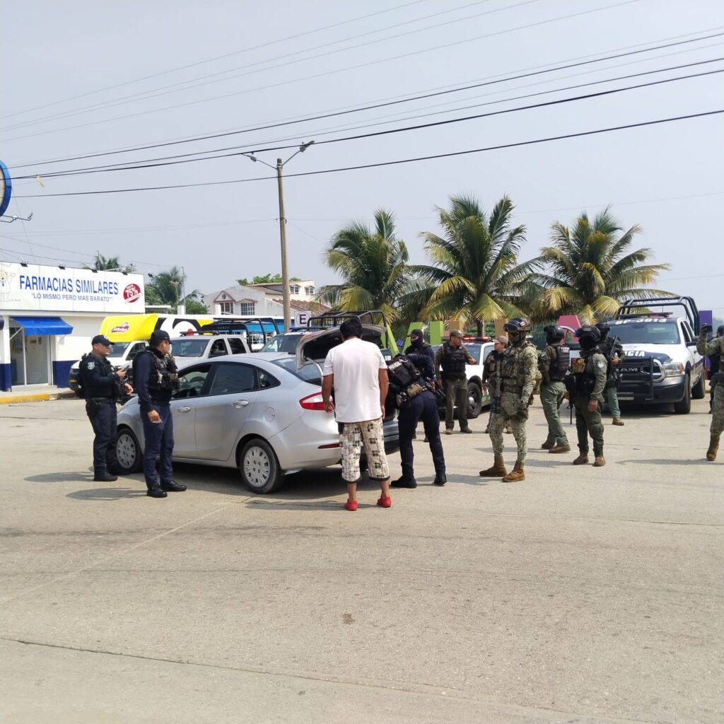 Xalapa, Ver., 8 de julio de 2024.- Por instrucciones del Gobernador del Estado, Cuitláhuac García Jiménez, fuerzas policiales encabezadas por efectivos de la Secretaría de Seguridad Pública (SSP), a través de Policía Estatal en coordinación con SEMAR, SEDENA y Guardia Nacional redoblaron las acciones, mediante la implementación de filtros de revisión y las Bases de Operaciones Mixtas en Coatzacoalcos.