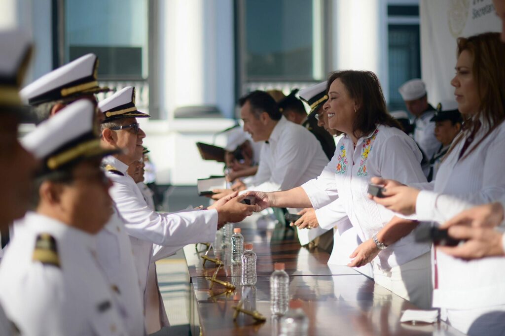 Veracruz, Ver.- La gobernadora electa de Veracruz, Rocío Nahle García, asistió a la Ceremonia de Ascensos e Imposición de Condecoraciones en el marco del Día de la Armada de México.