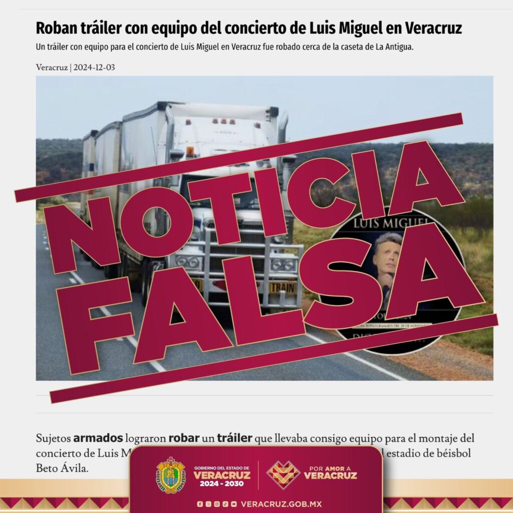 Xalapa, Ver.- El Gobierno del Estado de Veracruz desmintió categóricamente el presunto robo de un tráiler que transportaba equipo para el montaje del concierto de Luis Miguel, programado para la noche de este miércoles en el estadio de beisbol Beto Ávila, en la ciudad de Boca del Río.