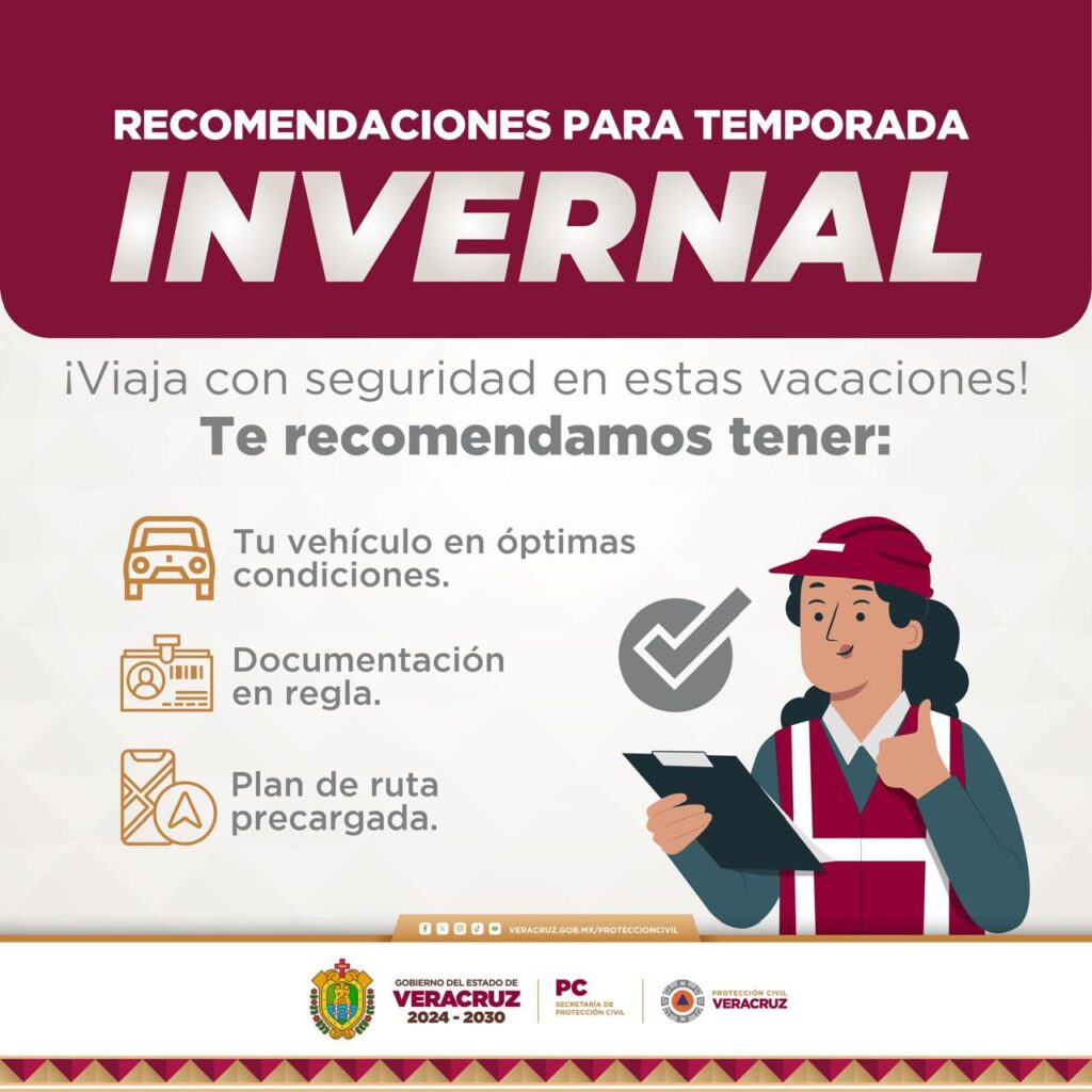 Xalapa, Ver.- Durante el periodo vacacional de invierno, la Secretaría de Protección Civil (PC) insta a la población a adoptar medidas preventivas que garanticen un tránsito seguro y salvaguarden la integridad de las familias que se desplazan por las carreteras del estado.