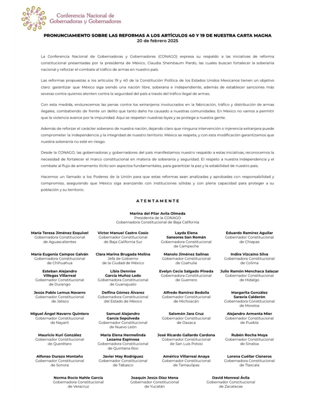 Por ello se sumó al pronunciamiento de la Conferencia Nacional de Gobernadoras y Gobernadores (CONAGO), que enfatizó la importancia de consolidar el marco constitucional en materia de seguridad y soberanía, destacando que estas reformas contribuirán a fortalecer la independencia del Estado mexicano y garantizar la paz y estabilidad del país.