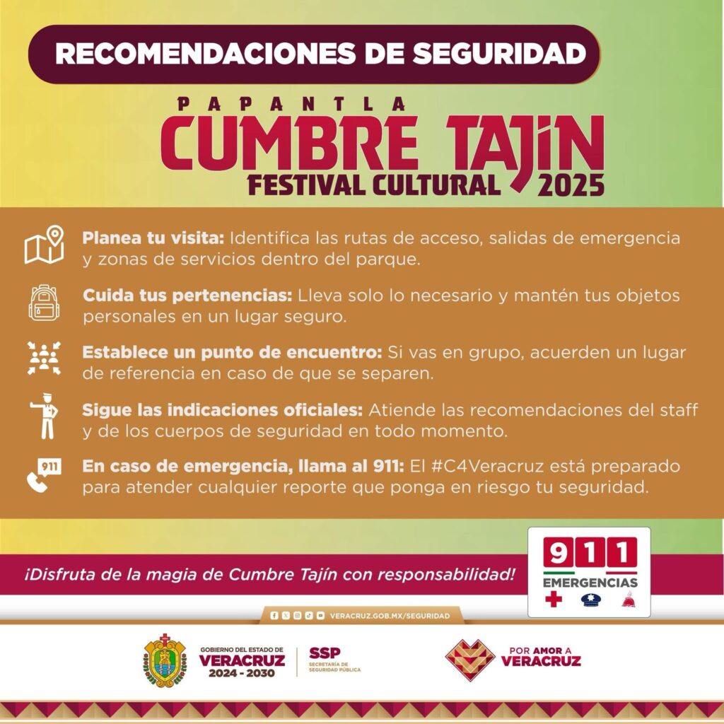 Xalapa, Ver.- La Secretaría de Seguridad Pública (SSP), desplegará un operativo especial para garantizar la protección de los asistentes a Cumbre Tajín 2025 que se realizará del 19 al 23 de marzo en el Parque Takilhsukut en el municipio de Papantla.
