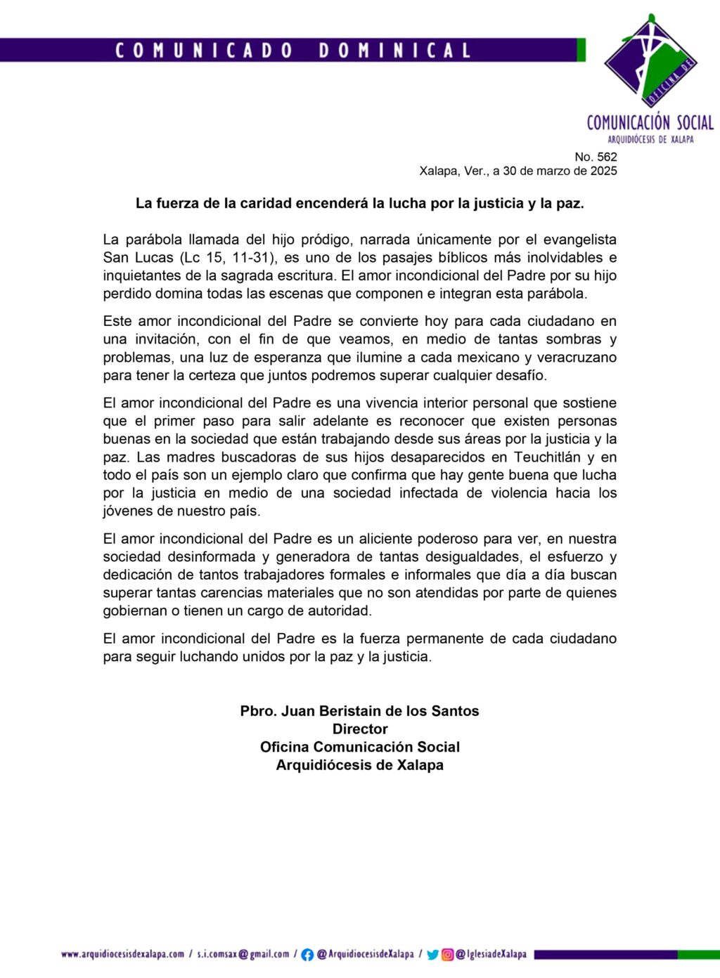 En el comunicado de este domingo, el sacerdote católico aseguró que el amor de los padres por los hijos se ve reflejado en el caso de las madres buscadoras, quienes luchan diariamente por localizar a sus hijos e hijas desaparecidas en el país.