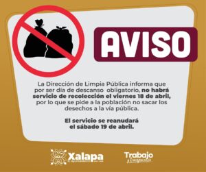 Redacción SFN Xalapa, Ver.- Por ser día de descanso obligatorio, el vieres 18 de abril no habrá servicio de recolección...