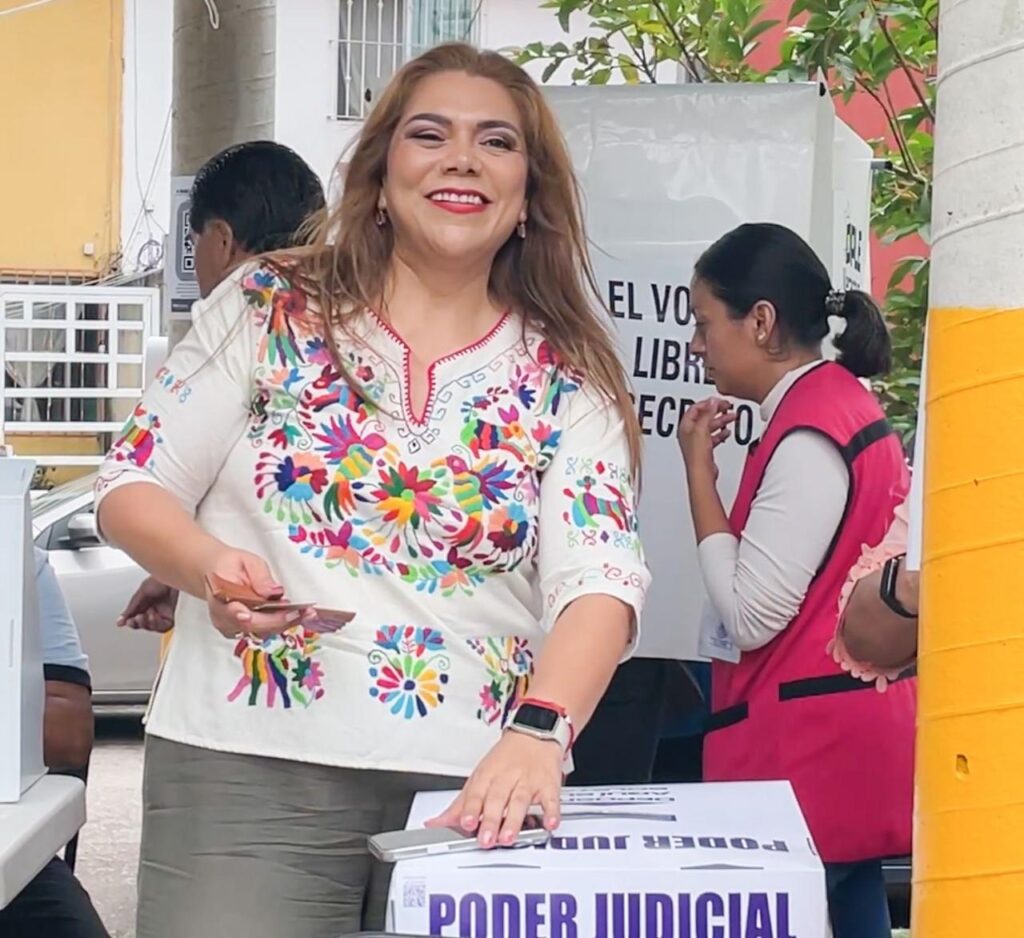 Xalapa, Ver.– La maestra Lisbeth Aurelia Jiménez Aguirre, candidata a magistrada en materia penal del Tribunal Superior de Justicia del Estado de Veracruz, acudió este domingo a emitir su voto en el marco de la jornada electoral para la renovación de cargos jurisdiccionales mediante voto ciudadano, por primera vez en la historia de la entidad.