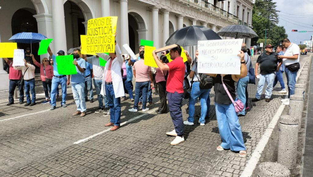 Xalapa, Ver.- Ex trabajadores del extinto Seguro Popular denunciaron la falta de pago por parte de Servicios de Salud de Veracruz a laudos firmes que tienen para más de 90 afectados, por lo que esta mañana se manifestaron en Plaza Lerdo, realizando bloqueos intermitentes de la avenida Enríquez.
