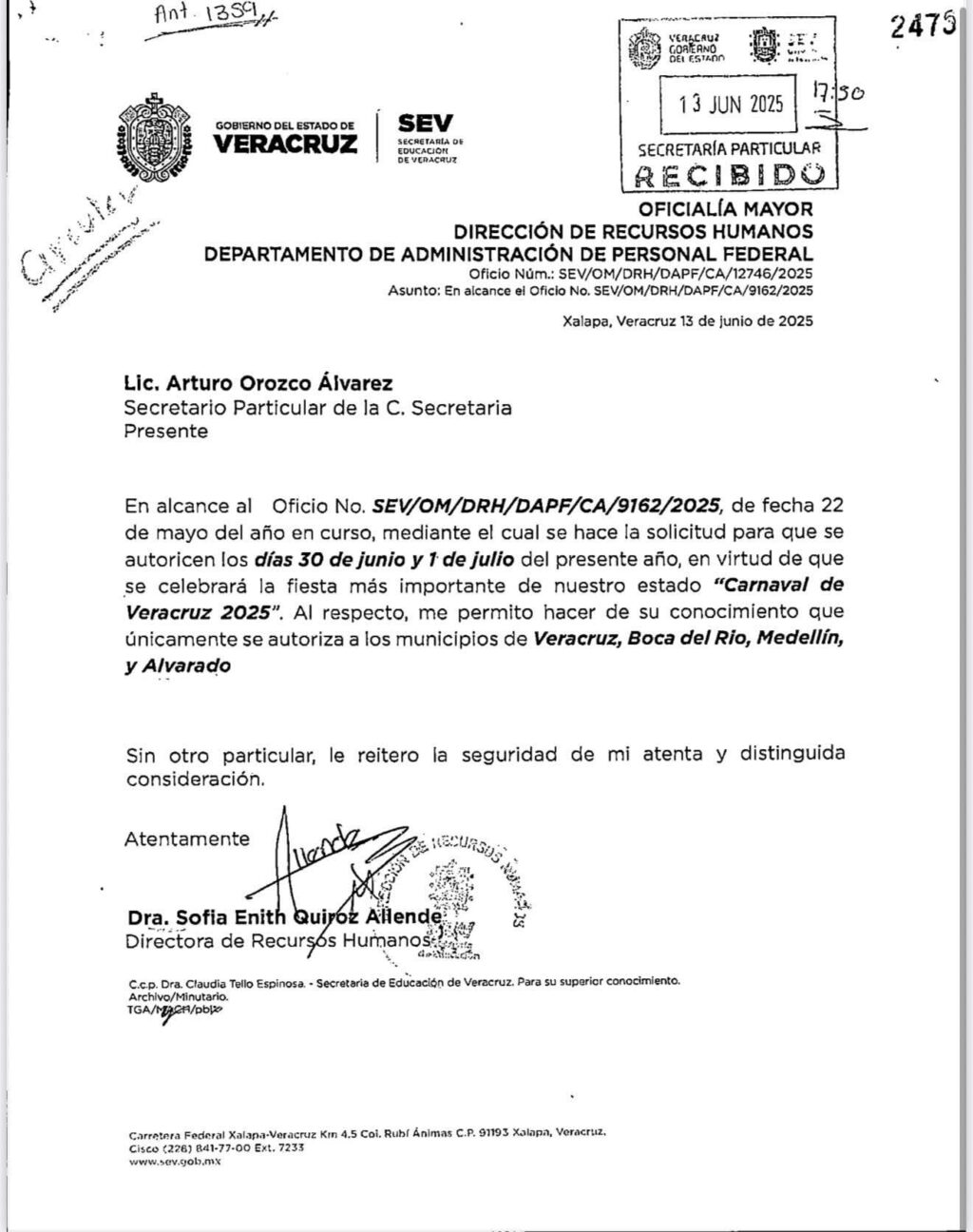 En el Oficio SEV/OM/DRH/DAPF/CA/12746/2025 firmado por la jefa de Recursos Humanos, Sofía Enith Quiroz Allende le informa a Arturo Orozco Álvarez, secretario particular de la secretaria Tello, que solo se autorizó la suspensión de labores los días 30 de junio y 1 de julio para los municipios arriba mencionados, dejando fuera a Xalapa.