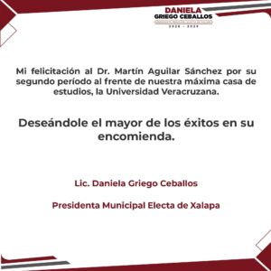 Yhadira Paredes Xalapa, Ver.- La alcaldesa electa de Xalapa, la morenista Daniela Griego Ceballos felicitó en sus redes sociales a Martín...