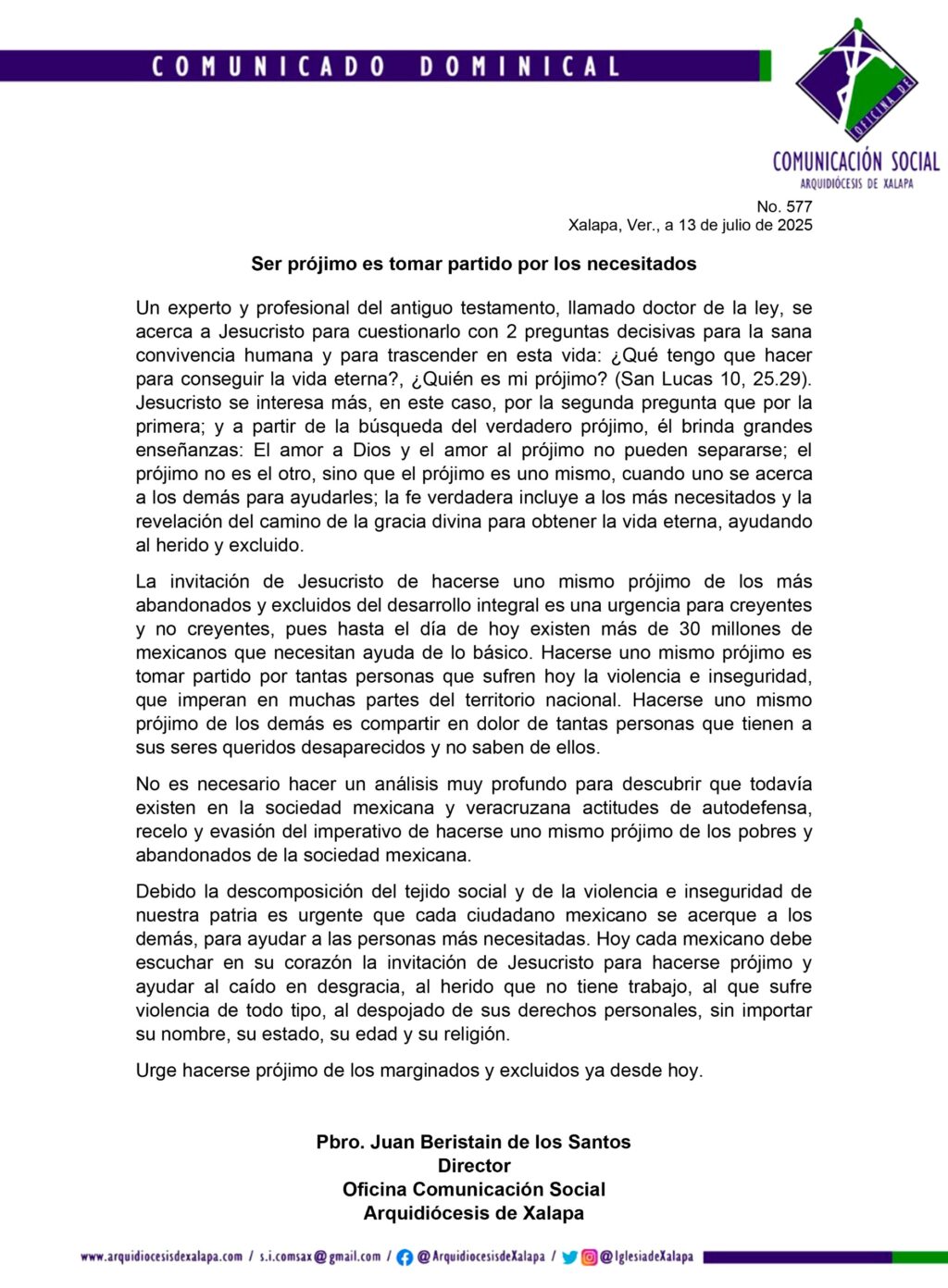 A través del comunicado de la Arquidiócesis de Xalapa, el vocero de la misma, Juan Beristaín de los Santos aseveró que hacerse uno mismo prójimo de los demás es compartir el dolor de tantas personas que tienen a sus seres queridos desaparecidos y no saben de ellos.