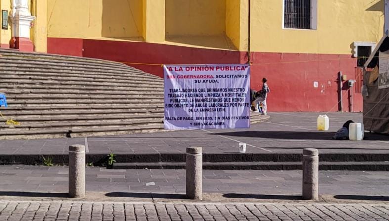 Con una lona dirigida “a la opinión pública” y a la gobernadora del estado, los inconformes señalaron que enfrentan falta de pago, ausencia de seguridad social, negación de días festivos y vacaciones.