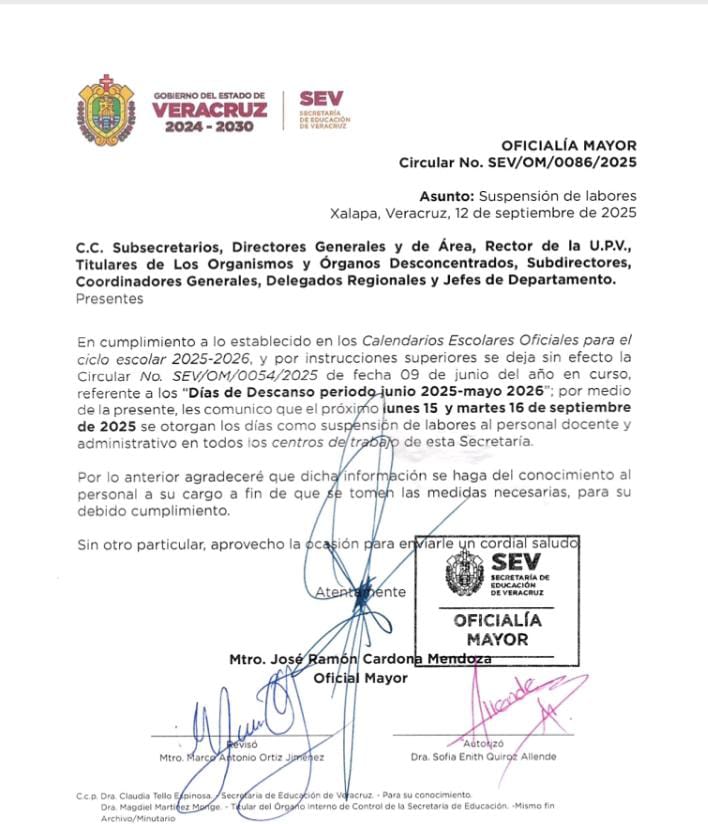 “Por medio de la circular les comunico que el próximo lunes 15 y martes 16 de septiembre se otorgan los días como suspensión al personal docente y administrativo en todos los centros de trabajo de esta Secretaría”, señala el documento.