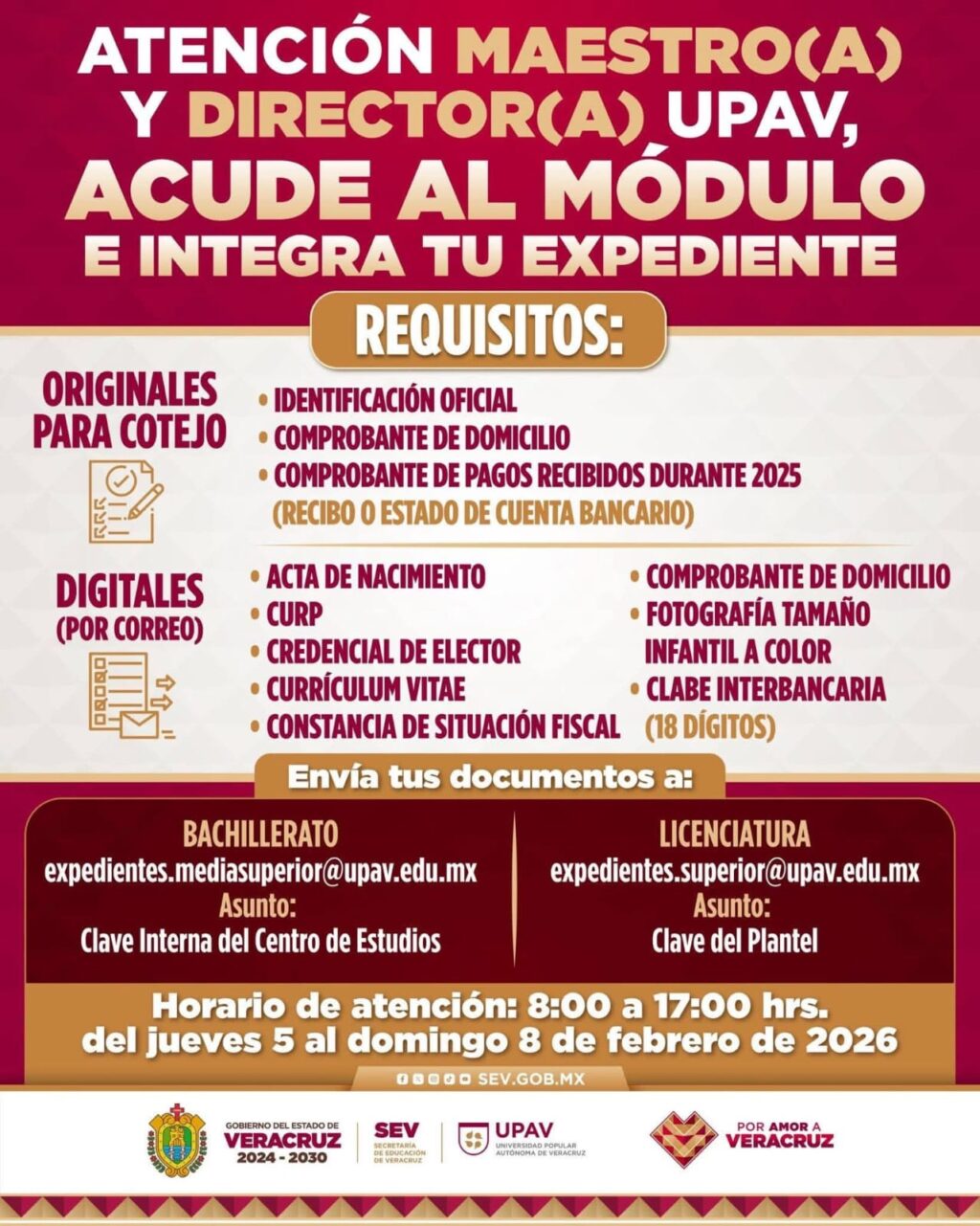 Estos módulos atenderán exclusivamente a personal docente y directivo de Educación Media Superior y Educación Superior de la UPAV, para la correcta integración de su expediente institucional, mediante la presentación de documentación impresa para cotejo y el envío de archivos en formato digital.