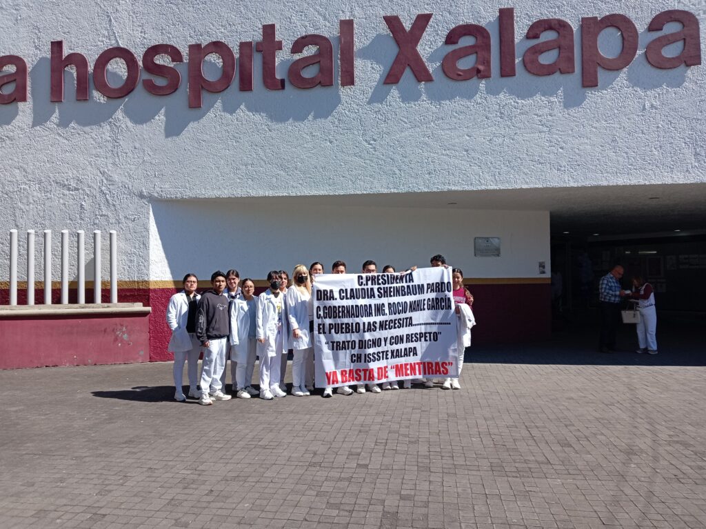 El grupo de Médicos Internos de Pregrado se reunieron en la explanada de la Clínica Hospital, con una pancarta en la que solicitaban la intervención de la presidenta Claudia Sheinabum y de la gobernadora Rocío Nahle García.