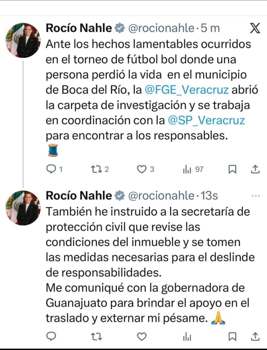 En sus redes sociales, la mandataria de Veracruz señaló que ante los hechos lamentables ocurridos en el torneo de futbol donde una persona perdió la vida, la Secretaría de Seguridad Pública del Estado se coordina para dar con los responsables.